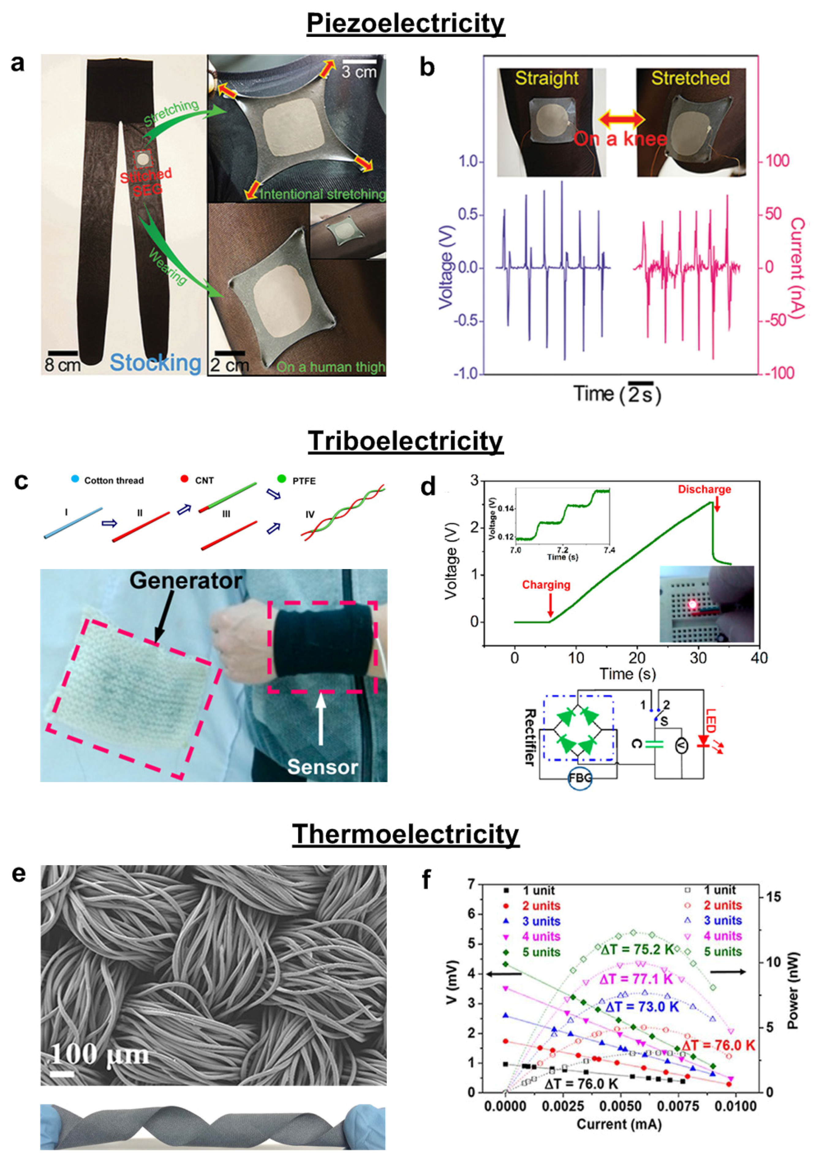 Further, Jeong et al. reported a novel approach to fabricating a high-performance hyper-stretchable nanogenerator (SEG) with extremely long Ag NWs [162]. The hyper-stretchable piezoelectric elastic composite (PEC) rubber polymer was composed of very long nanowire percolation (VLNP) electrodes and a well-dispersed mixture of lead magnesioniobate lead titanate (PMN-PT) particles and multi-walled carbon nanotubes (MWCNTs). The composite exhibited high stretchability over 200% strain without any mechanical cracking; this could be attributed to variation in the piezoelectric dipoles in the PEC caused by stretching, and helps accumulate electrons, generating voltage and current. An open-circuit voltage (~4 V) and short-circuit current (~500 nA) were obtained and the generated energy can sufficiently operate commercial electronic units. The SEG was tested in biological motion after being sewn onto the knee of a stretchable stocking, as shown in Figure 9a,b [162]. However, textile-type energy harvesters seem to face some prevalent problems such as low energy conversion efficiency, wide spectra of vibration frequencies, and time-dependent amplitudes.