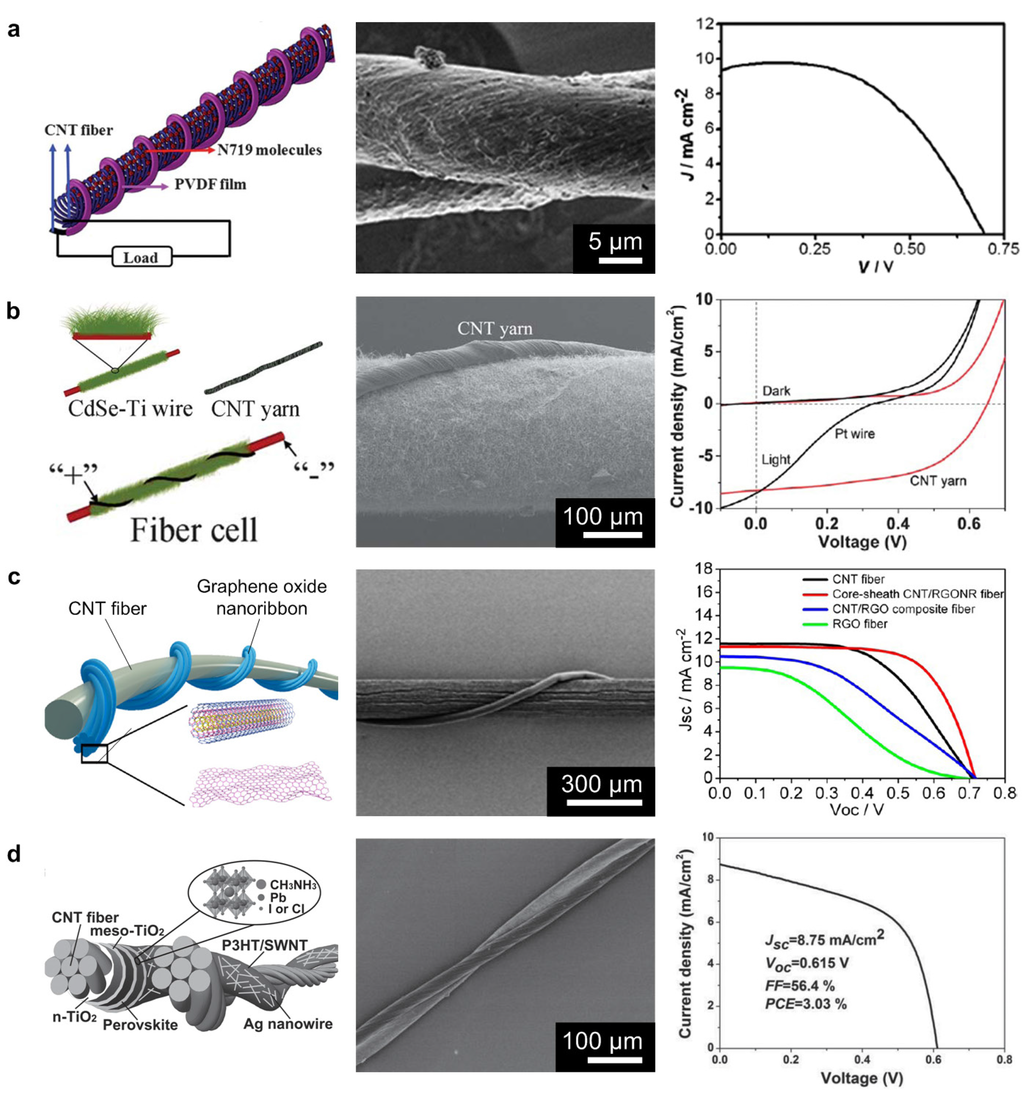 Zhang et al. demonstrated CdSe NWs and CNT yarn-based photovoltaics, with power conversion efficiency up to 3% [179]. The left image in Figure 10b presents a schematic illustration of fiber-based CdSe-grafted Ti wire fabricated via chemical vapor deposition (CVD) with twisted CNT yarn. The SEM image in Figure 10b shows that the twisted CdSe-Ti wire and CNT fiber make smooth contact without the addition of electrolyte due to the flexibility of the yarn. The performance of CNT yarn and CdSe-Ti wire heterojunction with polysulfide electrodes was characterized by measuring the J-V curve of the fiber cells. The open-circuit voltage (Voc), short-circuit current density (Jsc), fill factor (FF), and efficiency were 0.65 V, 8.25 mA·cm−2, 55%, and 2.9%, respectively.