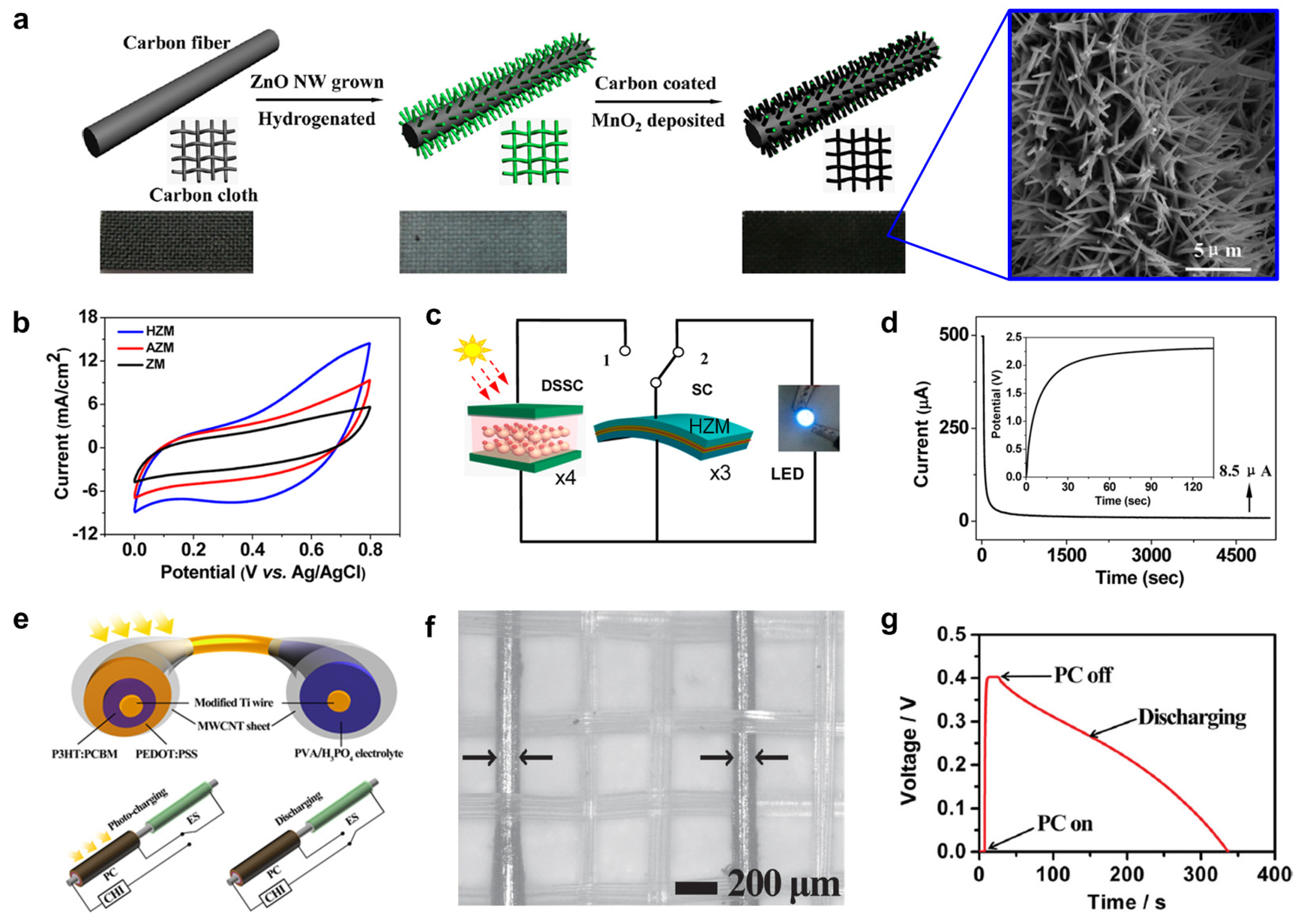 (a) Schematic fabrication process and SEM image of a hydrogenated single crystal ZnO (HZM) and amorphous ZnO-doped MnO2 core-shell electrodes; (b) Current-potential characterization with different electrodes with scan rates of 100 mV/s; (c) Design of a stand-alone self-powered system consisting of dye-sensitized solar cells (DSSCs), SCs, and LEDs; (d) Leakage current characteristics of three SCs in series and voltage profile (inset) charged by four DSSCs in series; (e) Schematic illustration and circuit connection mechanism in the process of charging and discharging of photovoltaic conversion (PC) and energy storage (ES) with titania nanotube-modified Ti wire and aligned MWCNT sheet as two electrodes; (f) Photography of energy fibers woven with each other to form flexible textiles; (g) Charging-discharging curve with a current of 0.1 μA during the discharging process with the ES part. Reproduced from [188,191] with permissions by ACS Publications, Copyright 2013 and by John Wiley & Sons, Copyright 2014.