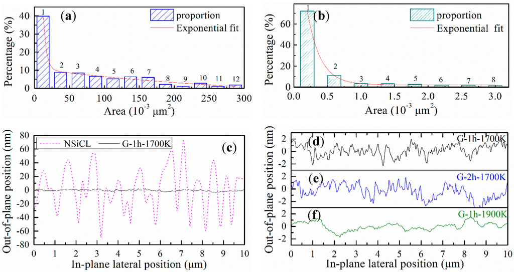 To further investigate the in-plane and out-of-plane feature sizes of NSiCL and graphene, we performed line-sectional analyses on AFM images. Using a horizontal line across the middle of the images, sectional data were extracted from AFM images in Figure 1, where the undulating topographies of NSiCL and graphene with position changes are clearly shown in Figure 2c–f. The in-plane feature sizes are consistent with results from the statistical distribution analyses (Figure 2a,b), while the out-of-plane feature sizes of NSiCL and graphene are significantly different. The former are in a range of 20 nm–140 nm, while the latter only several nanometers. The amplitude of the out-of-plane graphene features is so small that they mostly form a straight line on the sectional analysis graph when compared to that of the NSiCL (Figure 2c). The feature size profiles of graphene G-1h-1700K and G-2h-1700K are almost the same, except that the amplitude of the out-of-plane feature sizes of G-1h-1700K (Figure 2d) is slightly smaller than those of G-2h-1700K (Figure 2e). Compared to the rough profile of G-1h-1700K (or G-2h-1700K), which is composed of many zig-zag curves forming an undulating outline, the profile of G-1h-1900K is smoother, with each outline composed of none to a few zig-zag curves (Figure 2f).