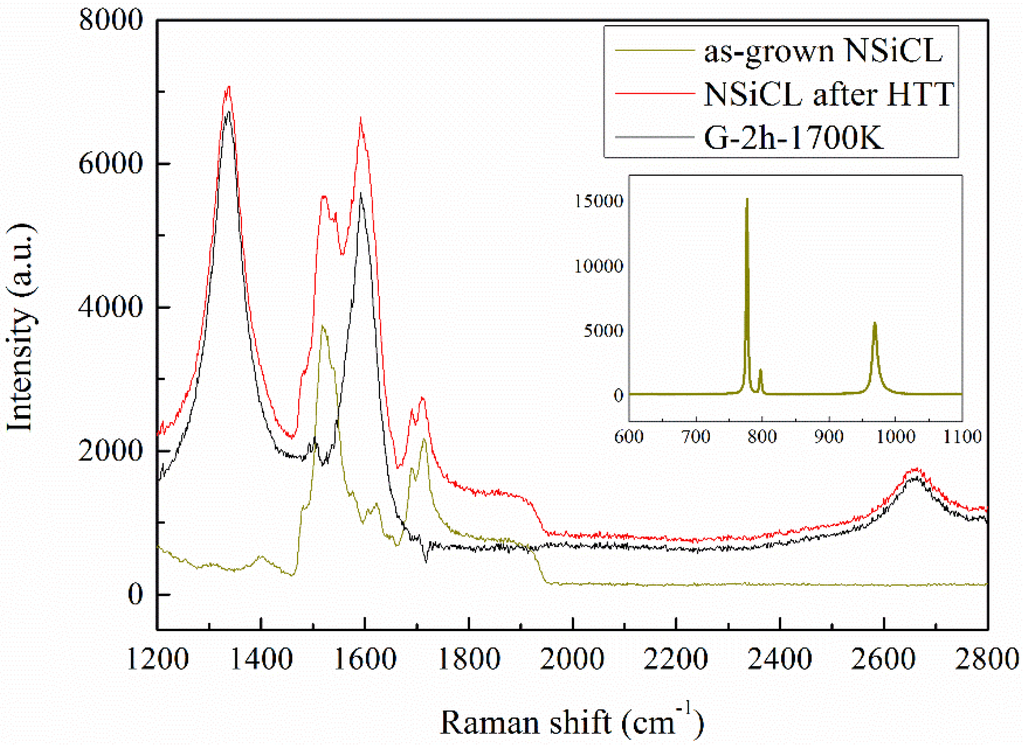We used Raman spectra to judge whether NSiCL is a 4H polytype, as well as find layer and defect information of the obtained graphene. Figure 3 shows respective Raman spectra of as-grown NSiCL and NSiCL subjected to high temperature treatment, respectively, and the derived graphene (sample G-2h-1700K). Judging from all the Raman spectra, the as-grown NSiCLs are the 4H polytype, as indicated by Raman peaks of the transverse optic (TO) mode and longitudinal optic (LO) mode, wholly belonging to the 4H polytype [30], while no other peak appears, such as the 3C polytype. After high temperature treatment, the Raman spectrum of NSiCL has three additional peaks in the range of 1200 cm−1–2800 cm−1. Usually named D mode, G mode, and 2D mode, respectively, peaks located at 1350 cm−1, 1580 cm−1, and 2700 cm−1 relate to graphene signals [31], which indicate that graphene has been obtained from NSiCL after high temperature treatment. To clearly illustrate the Raman spectrum of graphene, the SiC Raman signals are often subtracted [32].