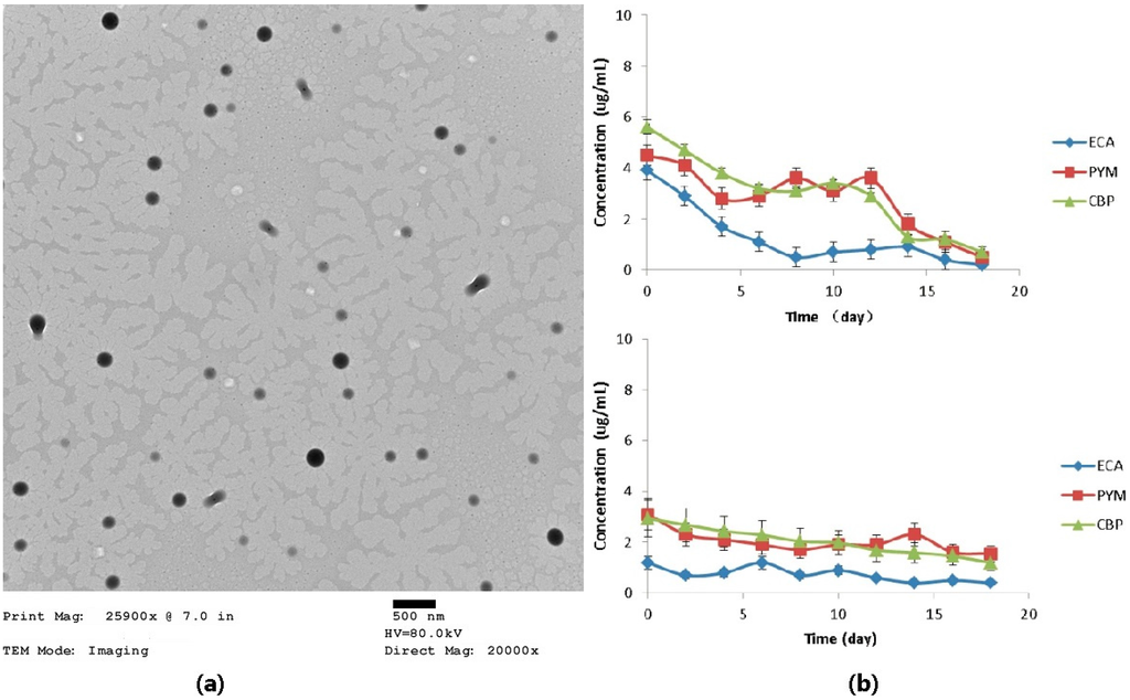 (a) Transmission electron microscope (TEM) pictures of MPEG–PLA–SS–ECA nanoparticles; (b) Cumulative release rates of nanoparticles in vitro.