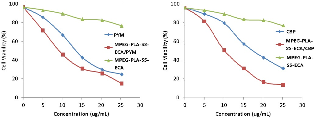 (a) SCC15/PYM cells were treated with PYM and MPEG–PLA–SS–ECA/PYM, cell viability and IC50 were determined by MTT assay. (b) SCC15/CBP cells were treated with CBP and MPEG–PLA–SS–ECA/CBP, Cell viability and IC50 were determined by MTT assay.