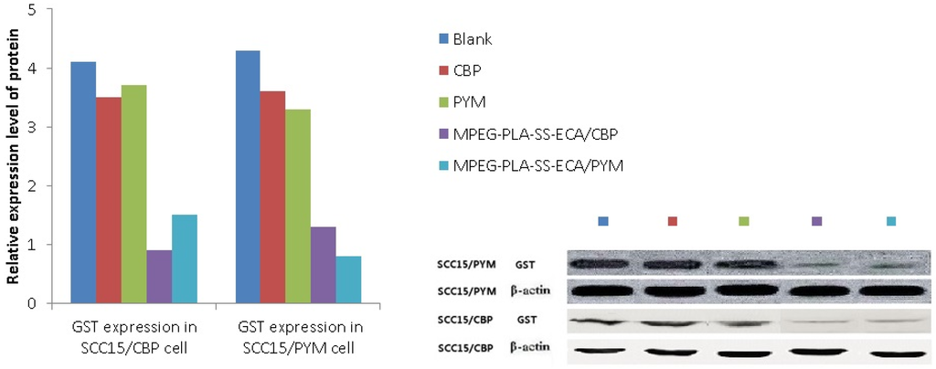 Oral squamous cell carcinoma SCC15/CBP and SCC15/PYM cells growing in the logarithmic growth phase were seeded in 100 mm plates and a control group (DMSO without drug) was set; on the next day, the drug (Pingyangmycin or carboplatin) and the drug-loaded nanoparticles containing the same concentration of the drug (pingyangmycin or carboplatin) were added to the plates, which was incubated for 24 h, and then cells in the different groups were collected for the extraction of full protein; the protein concentrations in the different groups were determined and equilibrated, and after the denaturation of the protein, the samples were kept at −70 °C with cryopreservation for Western-blot testing. Forty micrograms of the protein were loaded and electrophoresed by 10% SDS-PAGE gel electrophoresis, then the electrophoretic transfer was carried out and the membrane was blocked in 5% skim milk for 2 h; the membrane was incubated with the primary antibody rabbit anti-human (GST-π (1:500); β-actin (1:1500)) antibody at 4 °C overnight, washed 3 times for 10 h with TBST, incubated with the secondary body sheep anti-rabbit (GST-π (1:2500); β-actin (1:2500)) at room temperature for 1.5 h, washed with TBST again, and the color was developed with ECL. The images were obtained, recorded and analyzed by an image Quant LAS4000 imaging system.