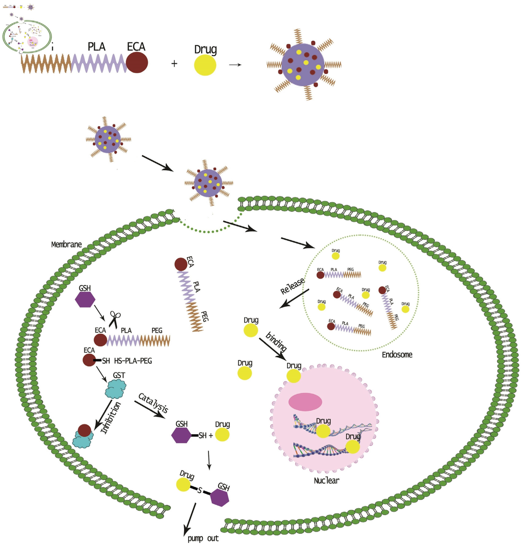 In this study, ethacrynic acid (ECA), a GST inhibitor, was coupled with poly (ethylene glycol)-poly (lactic acid) (MPEG–PLA) through disulfide bonds to prepare a redox-sensitive polymer MPEG–PLA–SS–ECA, and the polymer could self-assemble for the preparation of nanoparticles. Both the solubility and stability of the drug in the form of the prepared nanoparticles could be increased by the modification of the polyethylene glycol on the surface of the nanoparticles. The duration of the drug with a small particle size in the body and the concentration time of it at the tumor site could be ensured to be lengthened; that is, enhanced permeability and retention effect (EPR) [20,21]. By introducing the disulfide bond that could be cleaved by cysteine, the targeted release of GST inhibitors can be achieved to reverse the multidrug resistance in tumor cells. Human oral squamous cell carcinoma SCC15 cells were used for the study, in which SCC15/PYM and SCC15/CBP cell strains resistant to the chemotherapeutic drugs pingyangmycin (bleomycin) and carboplatin commonly used for oral squamous cell carcinoma were induced, respectively, and the pingyangmycin and carboplatin were encapsuled with MPEG–PLA–SS–ECA to prepare MPEG–PLA–SS–ECA/PYM and MPEG–PLA–SS–ECA/CBP nanoparticles, respectively. The prepared nanoparticles could accumulate in the tumor cells to effectively reduce the expression of GST protein in tumor cells and reverse the resistance of the drug-resistant cell strains (Scheme 1).