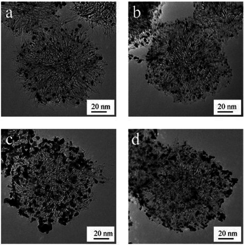 Transmission electron microscope (TEM) images of the supported catalyst: (a) 20 wt % Pt on as-grown single-walled carbon nanohorns (SWCNHs); (b) 20 wt % Pt on treated-SWCNHs; (c) 60 wt % Pt on as-grown SWCNHs; (d) 60 wt % Pt on treated SWCNHs. Reproduced with permission of [29]; American Chemical Society, 2009.