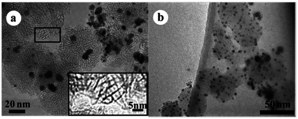 TEM images of (a) Pd-Pt/SWCNHs and (b) Pd-Au/SWCNHs synthesized by the GI-AIW method. The inset (in Figure 2a) resolves the horn structures of SWCNHs. Reproduced with permission of [40]; American Chemical Society, 2014.