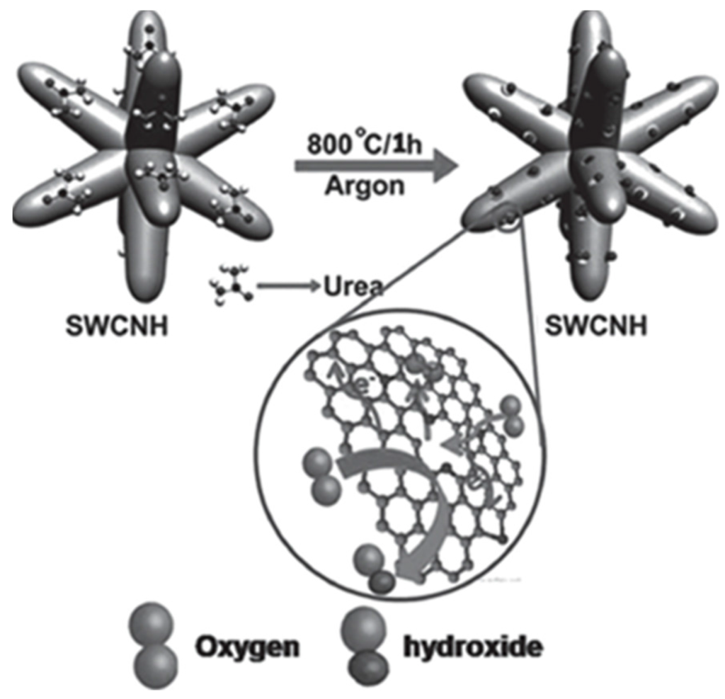 A schematic representation of the synthesis of nitrogen-doped SWCNH by treatment with urea at high temperature. The inset shows the active centers formed around the pore openings, which facilitates the oxygen-reduction reaction. Reproduced with permission of [43]; John Wiley and Sons, 2015.