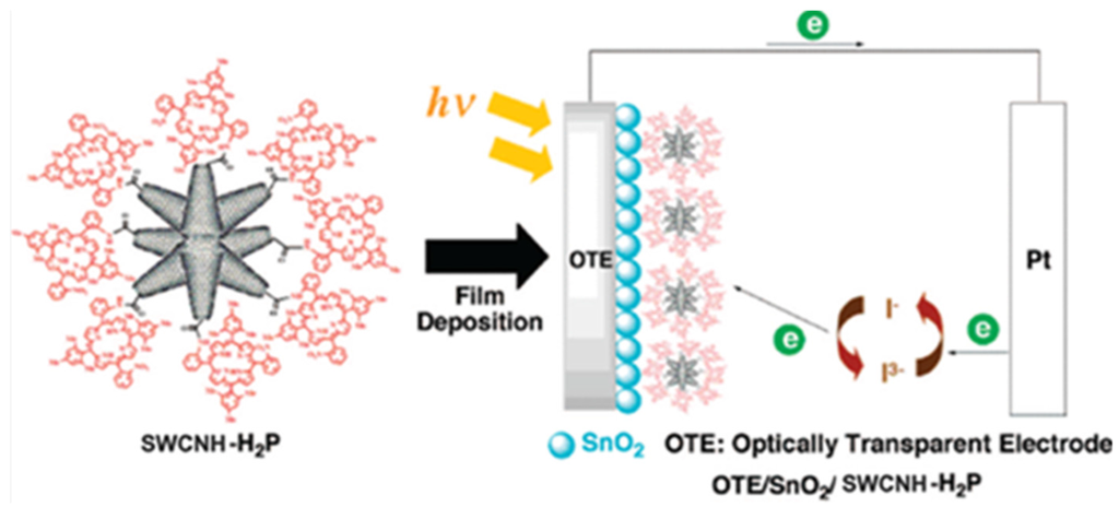 Hasobe et al. focused on the effect of dyes on the photo-electrochemical solar cell (Figure 4) [47]. They synthesized porphyrin functionalized SWCNHs (SWCNHs-H2P) which were implemented into optically transparent electrodes (OTE) cast by nanostructured SnO2 films (OTE/SnO2) by electrophoretic deposition. The SWCNHs-H2P/SnO2/OTE electrode displayed an incident photon to current conversion efficiency (IPCE) of 5.8% at an applied bias of 0.2 V vs. SCE in a standard three compartment electrochemical cell. The IPCE value was higher than the sum of each component. They found photo-induced electron transfer from the singlet excited state of porphyrin to the nanohorns, while direct electron injection from the reduced nanohorns to the conduction band of the SnO2 electrode takes place. Therefore, these processes ensure the generation of photocurrent. Then, they reported a SWCNHs-Zn porphyrin supramolecular assembly (SWCNHs-ZnP) for photo-induced electron-transfer processes [48]. An ammonium cation was attached to SWCNH through a spacer (sp) (SWCNH-sp-NH3+). Then, SWCNHs-ZnP nanohybrids were assembled by simply mixing crown ether functionalized zinc porphyrin complex (Crown-ZnP) and SWCNH-sp-NH3+ in DMF. The nanohybrids were then employed to fabricate films onto an OTE/SnO2 electrode by drop-cast method. The OTE/SnO2/SWCNH-sp-NH3+-Crown-ZnP electrode exhibited a maximum IPCE of 9% which was a little better than before [47]. Further, they synthesized a dimeric porphyrin [(H2P)2], which was then grafted onto the SWCNHs to form SWCNH-(H2P)2 hybrid material [49]. This material was electrochemically deposited onto an OTE/SnO2 to produce a photoactive electrode. The maximal IPCE value of 9.6% at 430 nm was observed, which is better than 3.9% for OTE/SnO2/(H2P)2 at 430 nm. The high loading of the electron donor component conjugated onto SWCNHs and its high molar absorptivity are key factors in enhancing and improving photoinduced electron transfer efficiency in SWCNH-based hybrid materials.