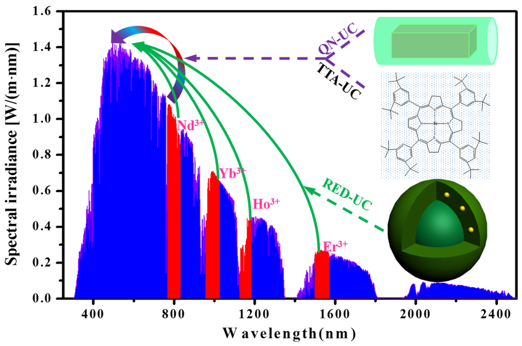 The absorption and emission range of three types of upconversion materials in reference to AM 1.5 spectrum (QN-UC (purple): upconversion in quantum nanostructures; TTA-UC (purple): triplet-triplet annihilation upconversion; RED-UC (green): Rare-earth-doped upconversion materials).