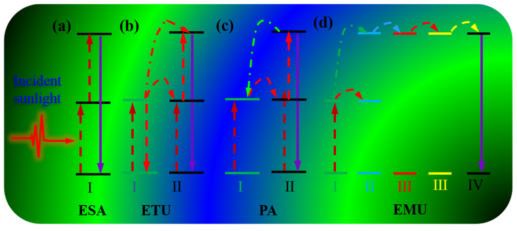 A schematic illustration of four typical upconversion processes: (a) Excited state absorption (ESA); (b) Energy transfer upconversion (ETU); (c) Photon avalanche (PA); (d) Energy migration-mediated upconversion (EMU).