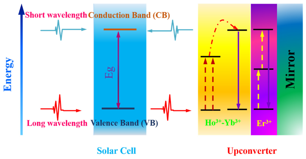 An operating mechanism for a c-Si solar cell with two upconverters, one co-doped with Ho3+–Yb3+ and the other one single doped with Er3+. Photons with short wavelength can be absorbed directly by the solar cell. The transmitted sub-bandgap light can be upconverted into high-energy photons, which would be absorbed by c-Si. The mirror behind the upconverter increases the probability of absorption of sub-bandgap light in the upconverter layer.