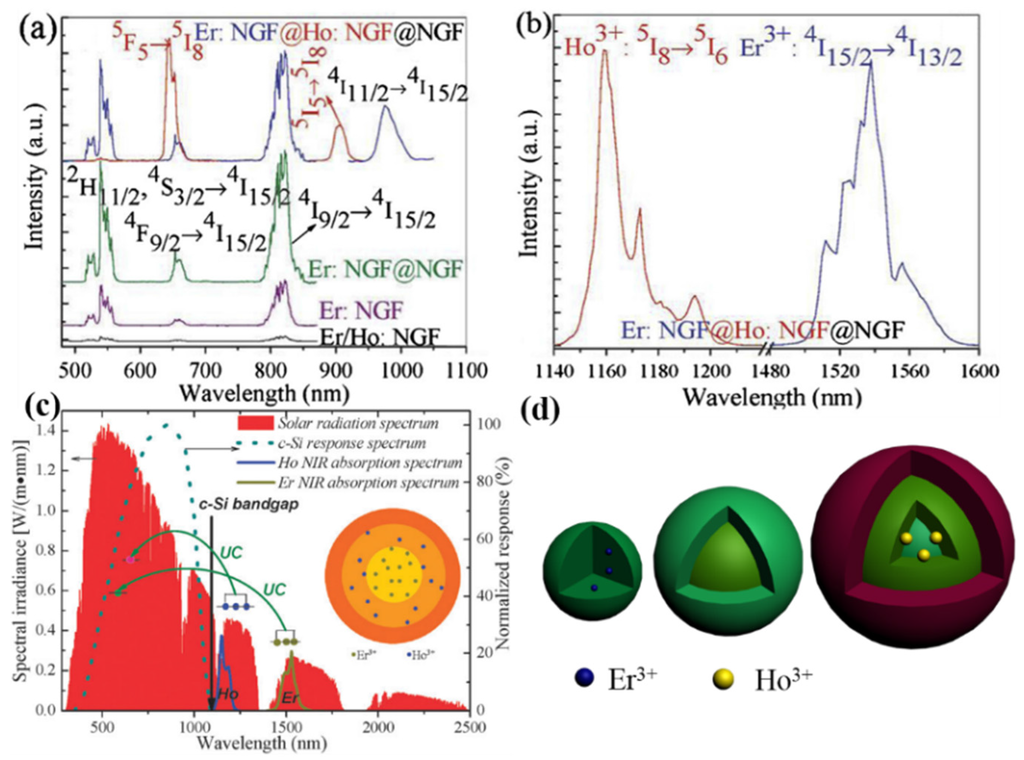 (a) Upconversion emission spectra of the core NaGdF4:Er3+/Ho3+ nanocrystals, the core NaGdF4:Er3+ nanocrystals, the core/shell NaGdF4:Er3+@NaGdF4 nanocrystals, and the NaGdF4:Er3+@NaGdF4:Ho3+@NaGdF4 core/shell/shell nanocrystals; (b) Upconversion excitation spectrum of the NaGdF4:Er3+@NaGdF4:Ho3+@NaGdF4 core/shell/shell nanocrystals; (c) A schematic illustration of the upconversion luminescence of NaGdF4:Er3+@NaGdF4:Ho3+@NaGdF4 nanocrystals versus the bandgap of c-for Si solar cell, and the spectrum of AM 1.5 sun irradiation; (d) A schematic of illustration of different nanostructures: the NaGdF4:Er3+ core, the NaGdF4:Er3+@NaGdF4 core/shell, and the NaGdF4:Er3+@NaGdF4:Ho3+@NaGdF4 core/shell/shell (adapted with permission from [87]; Copyright Royal Society of Chemistry, 2012).