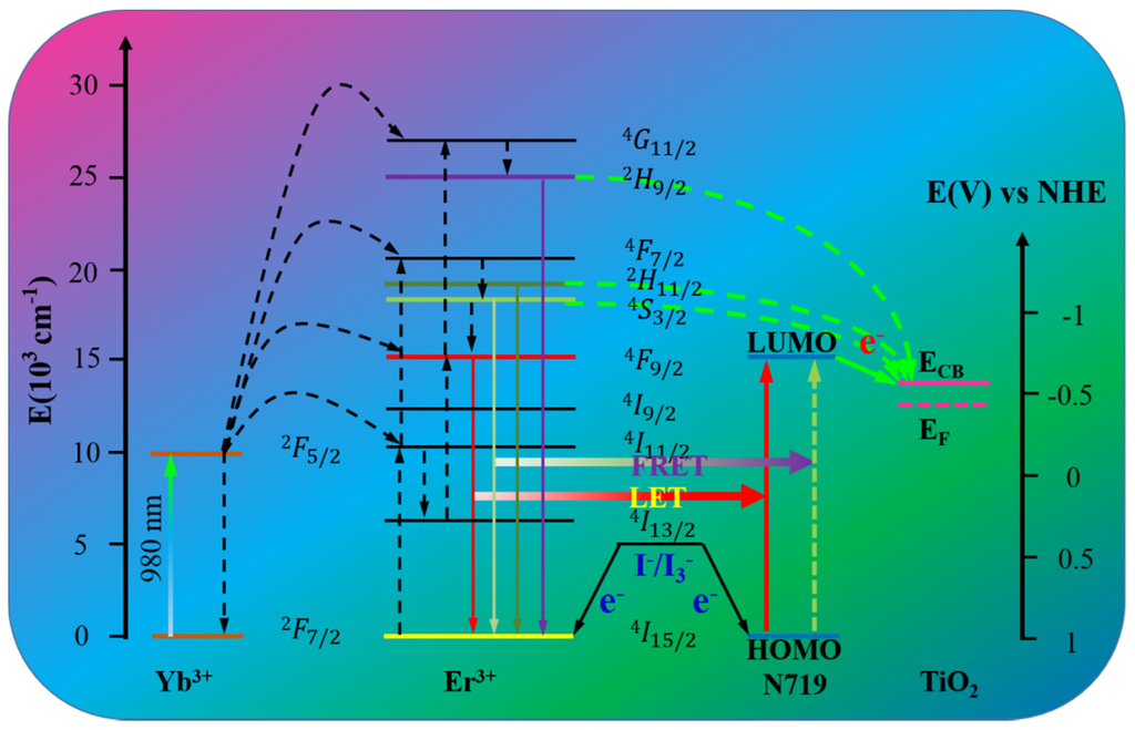 Researchers also placed a lot of effort in the application of RED-UC structures in photoanode layers. Wang et al. [125] achieved an efficiency increase of 23% when doping YOF:Yb3+/Er3+ particles into the TiO2 photoanode layer. Zhang et al. exploited the use of NaYF4:Er3+/Yb3+@TiO2 core-shell composite as a photoanode. The conversion efficiency was enhanced by a factor of 1.23 [126]. To avoid electron recombination losses, Zhao et al. separated the upconversion and TiO2 layers by growing the middle SiO2 layer between them, achieving an improvement of 29.4% in efficiency [127]. In another way, Demopoulos et al. [128] investigated the utilization of β-NaYF4:Yb3+/Er3+@TiO2 submicro particles as both a light harvesting and an IR energy relay layer. An optimization of the layer of the DSSC structure resulted in a 16% relative increase of power conversion efficiency. On the other hand, there are a number of studies using a range of RED UC materials doped with Yb3+-Er3+ [68,129,130], Yb3+-Tm3+ [29], Er3+ [131], for improving the NIR response of DSSCs, and the following illustration (Figure 10) presents the energy transfer mechanisms in a DSSC equipped with a upconverter codoped with Yb3+ and Er3+.
