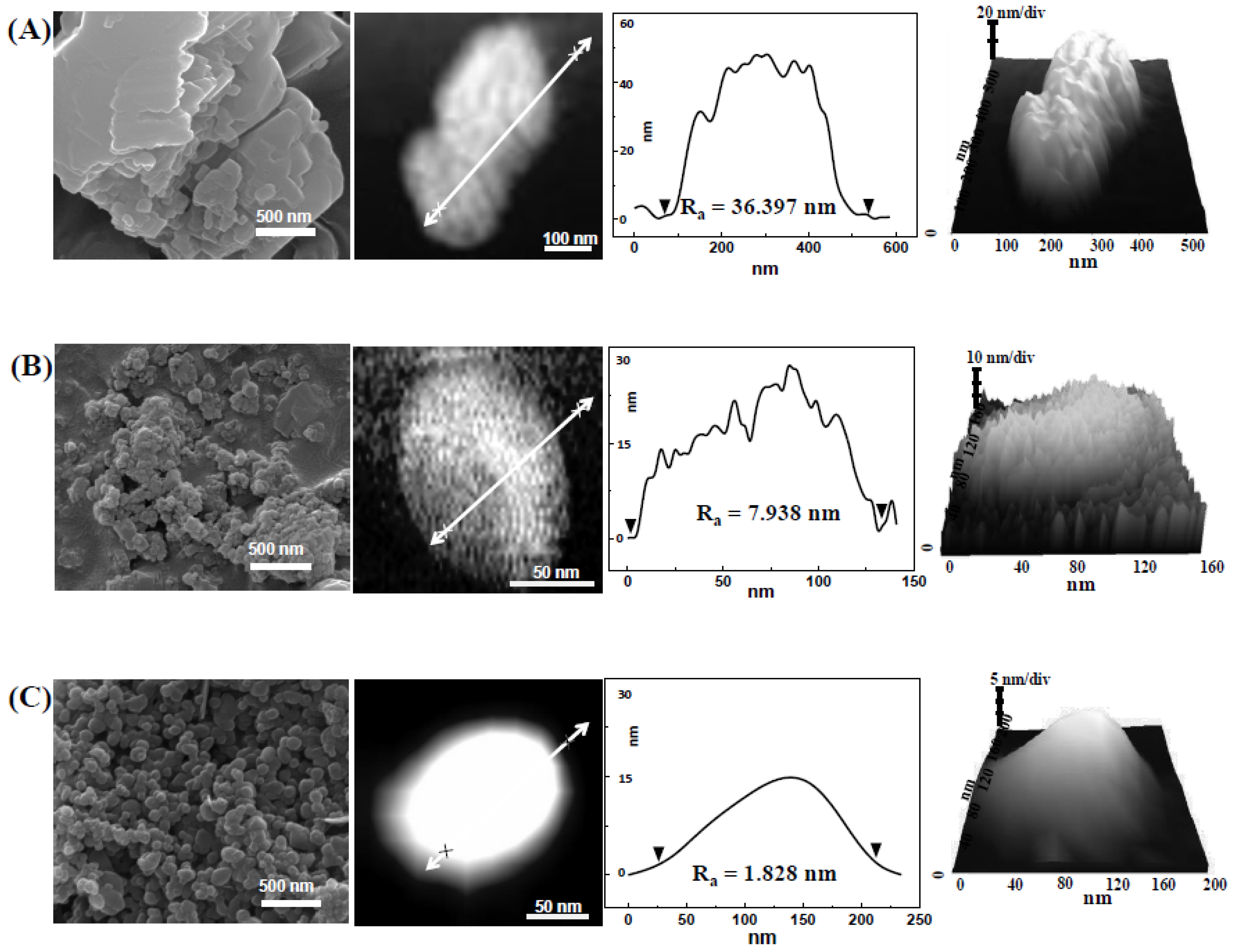 Scanning electron microscopy (SEM) images, atomic force microscope (AFM) images, height profiles, and 3D images of (A) food bulk CaCO3; (B) food nano CaCO3; and (C) SS CaCO3.
