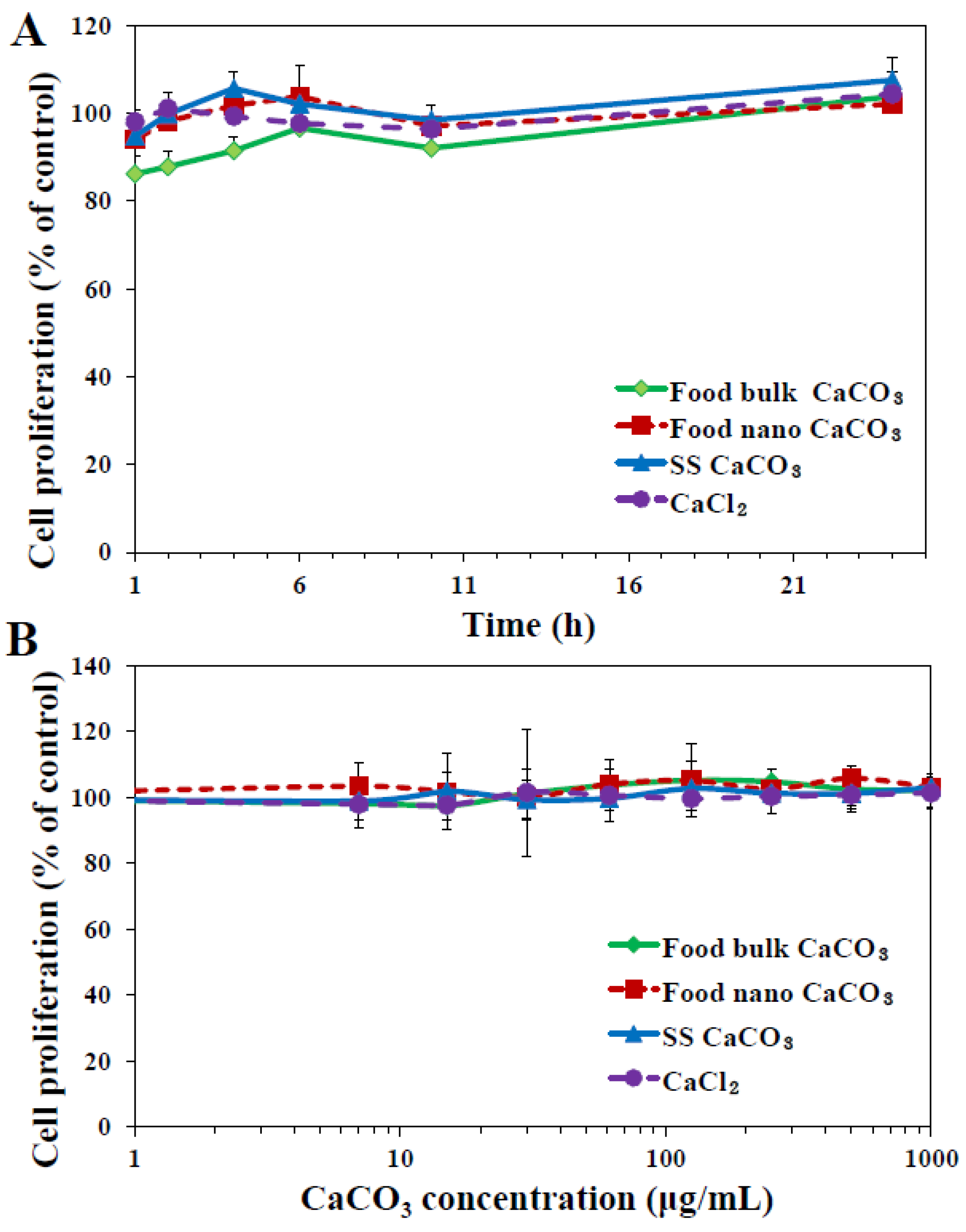 Effect of three different types of CaCO3 particles on cell proliferation of human intestinal INT-407 cells, as measured by water-soluble tetrazolium salts (WST-1) assay. (A) Cell proliferation exposed to 250 μg/mL particles or an equivalent amount of CaCl2 (based on calcium content) for 1–24 h; (B) Cell proliferation treated with different concentrations of CaCO3 particles or CaCl2 for 24 h.