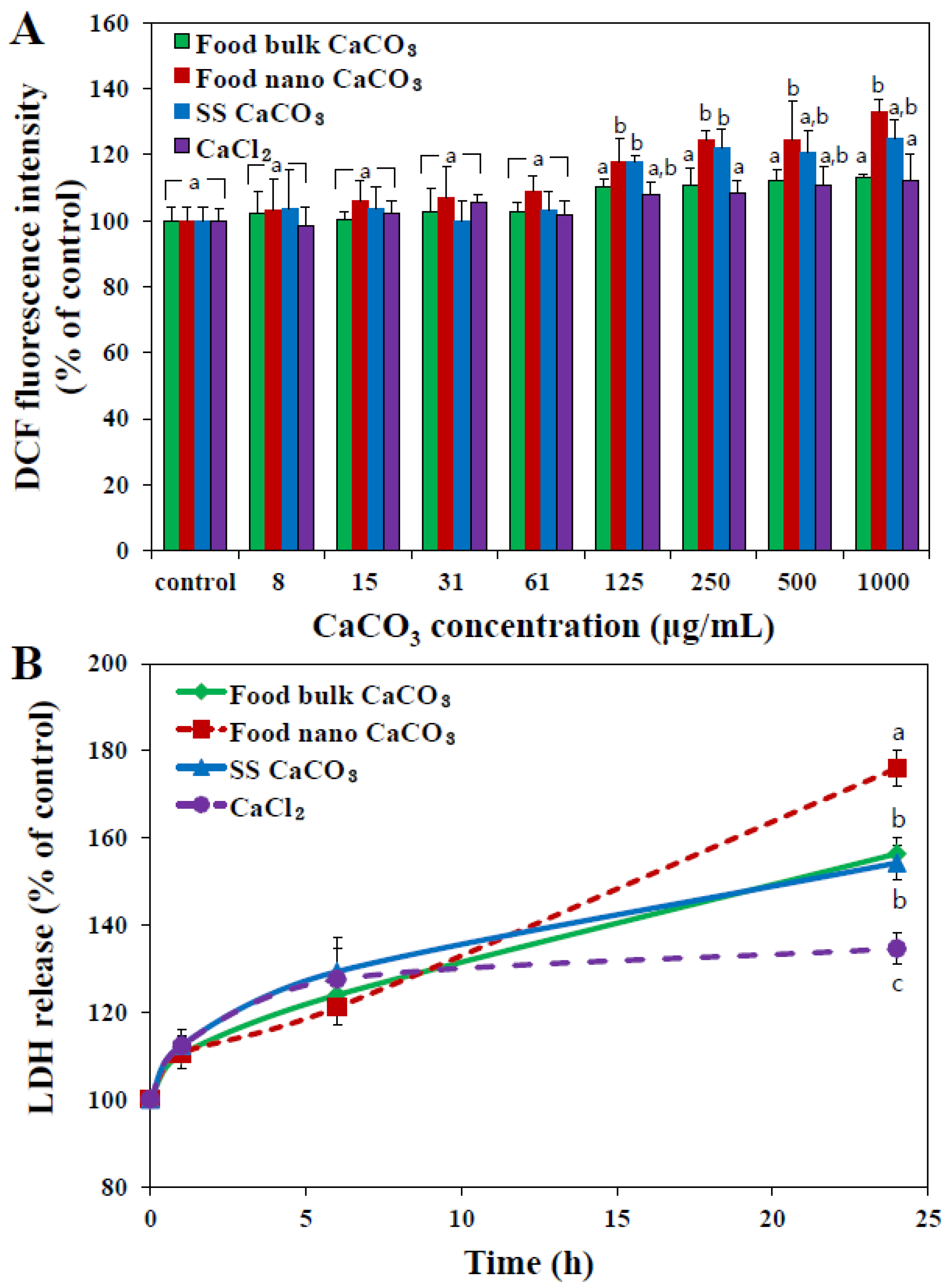 Effect of three different types of CaCO3 particles or an equivalent amount of CaCl2 (based on calcium content) on (A) ROS generation and (B) lactate dehydrogenase (LDH) release from human intestinal INT-407 cells after 24 h of incubation. The mean values with different letters (a, a,b, b, c) at the same concentration or time points indicate statistically significant difference (p < 0.05).