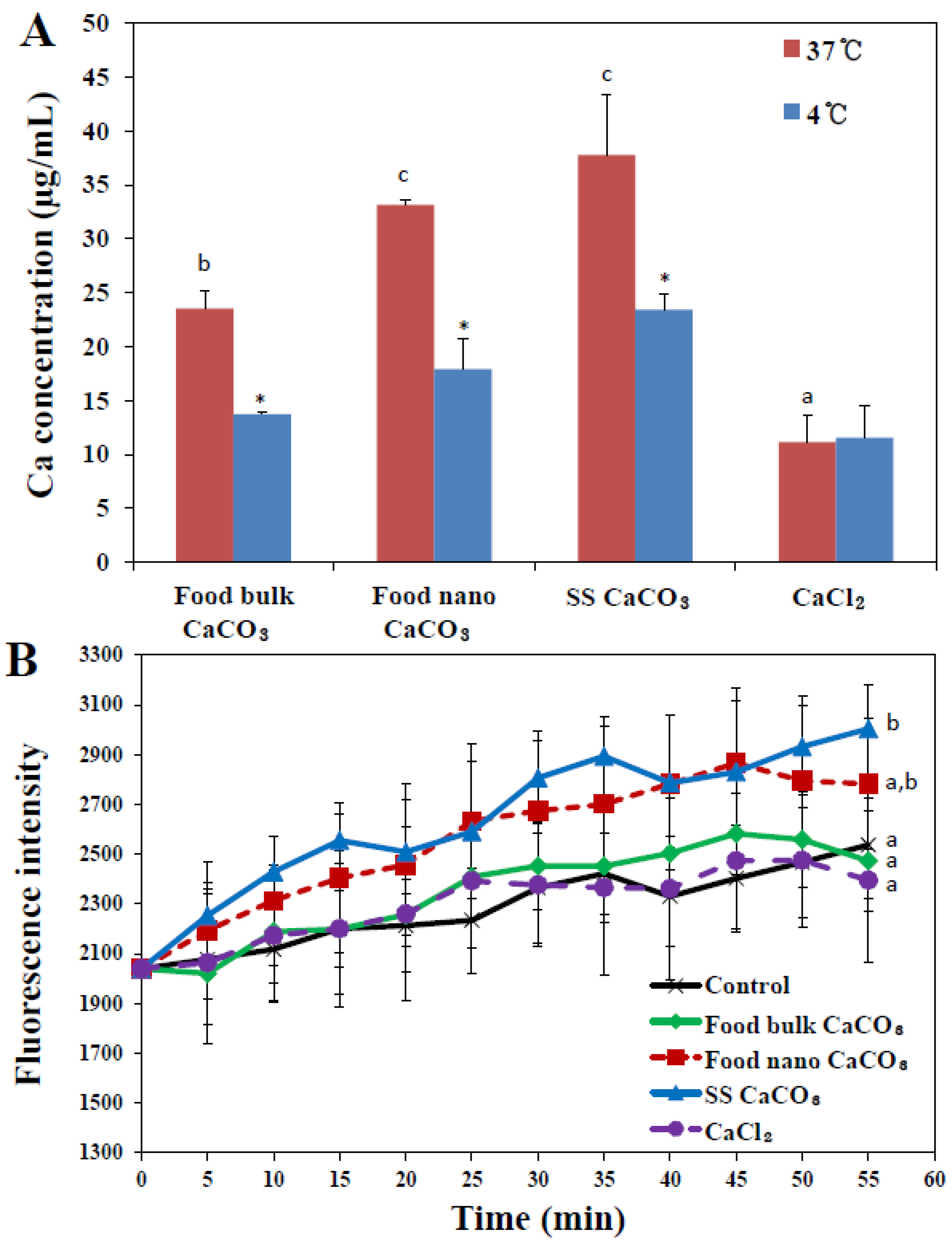 (A) Cellular internalization of three different types of CaCO3 particles or an equivalent amount of CaCl2 (based on calcium content) in human intestinal INT-407 cells after 2 h of incubation, as measured by inductively coupled plasma-atomic emission spectroscopy (ICP-AES); (B) intracellular Ca2+ levels monitored with Calcium Green™−1 probe (Life Technologies, Carsbad, CA, USA). The mean values with different letters (a, a,b, b) at the same temperature or time points indicate statistically significant difference (p < 0.05). * denotes significant difference in uptake amount between 37 and 4 °C (p < 0.05).