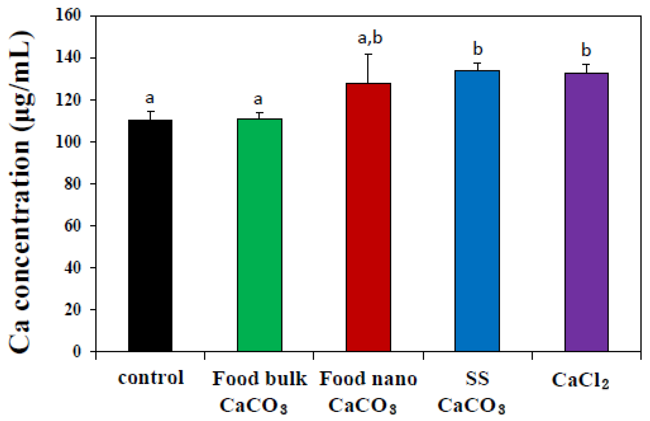 Calcium is essential for the formation and maintenance of bones and teeth, cellular physiology, immune response, hormone secretion, activation of enzymes, and blood-clotting system [1,2]. Calcium carbonate (CaCO3) is the most prevalent form of a calcium supplement due to its abundance from nature, such as oyster and sea shells, as well as the most cost-effective [3]. However, oral bioavailability of CaCO3 is extremely low, since calcium is well absorbed into the body under acidic conditions and an alkaline CaCO3 requires stomach acid for better absorption [3,4,5]. Moreover, solubility of CaCO3 is known to be generally low compared to other inorganic nanoparticles [6]. The low efficacy of CaCO3 may be overcome by applying nano-sized materials, which can induce cellular uptake by endocytosis [7,8], different uptake pathways from that for Ca2+ ions [9]. Much research has demonstrated that nanoparticles can be internalized into cells by energy-dependent endocytosis, consequently contributing to enhanced uptake efficacy [10,11,12].