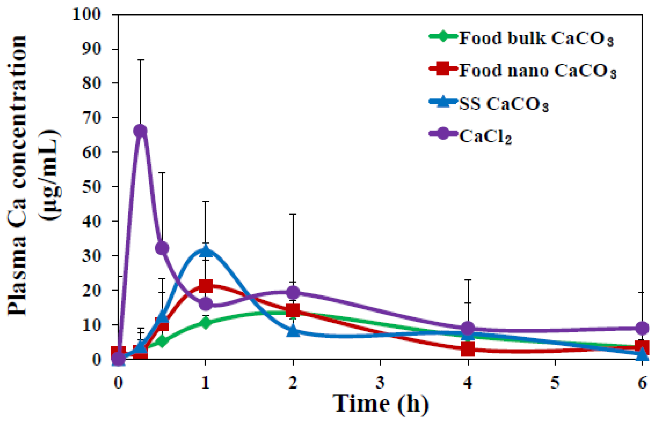 In vivo oral absorption of CaCO3 particles was also evaluated following a single-dose oral administration to rats. Figure 7 demonstrates different plasma concentration-time curves of three CaCO3 particles; SS CaCO3 and food nano CaCO3 particles showed more rapid absorption, showing peak concentration at 1 h versus 2 h for food bulk CaCO3. Interestingly, slightly high peak concentration at 1 h was found for SS CaCO3 than food nano CaCO3 and retarded decrease in peak concentration was observed for food nano CaCO3 compared to SS CaCO3. This might be explained by the different hydrodynamic size distribution in spite of similar specific surface area values between two nanoparticles, as shown in Figure 2; SS CaCO3 with narrow size distribution might be absorbed faster than food nano CaCO3, while food nano CaCO3 having larger hydrodynamic size is absorbed more slowly. The delayed absorption profile was also found for food bulk CaCO3, showing Tmax value at 2 h (Figure 7). On the other hand, Ca2+ ions were determined to behave differently from CaCO3 particles, with the highest maximum concentration at 15 min.