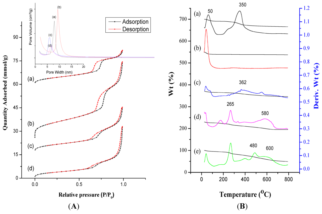 (A) Nitrogen adsorption–desorption isotherms of (a) as-synthesized IBN-4, (b) IBN-4 extracted, (c) IBN-4-NH2 and (d) IBN-4-HRP. Corresponding pore size distribution plots are shown in the inset figure. (B) Thermogravimetric analysis curves of (a) as-synthesized IBN-4; (b) IBN-4 extracted, (c) IBN-4-NH2, (d) IBN-4-NH-GA and (e) IBN-4-HRP.