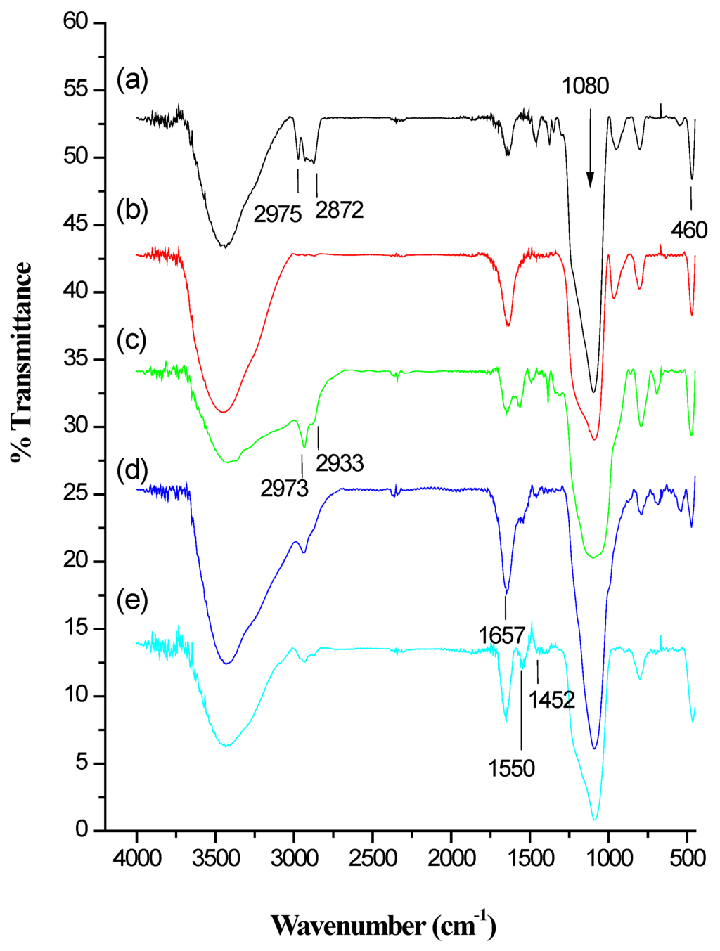 Fourier transform infrared spectroscopy (FT-IR) spectra of the (a) as-synthesized IBN-4 nanoparticles, (b) IBN-4 nanoparticles after surfactant removal (IBN-4-extracted), (c) IBN-4 nanoparticles modified with APTS groups (IBN-4-NH2), (d) IBN-4-NH2 nanoparticles modified with glutaraldehyde groups (IBN-4-NH-GA) and (e) IBN-4-NH-GA nanoparticles immobilized with HRP (IBN-4-HRP).