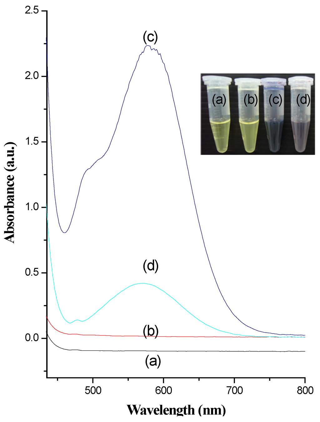Ultraviolet–visible (UV-Vis) spectra and white-light sample images (inset) of (a) ninhydrin alone, (b) IBN-4 nanoparticles after surfactant removal, (c) IBN-4 nanoparticles modified with APTS groups (IBN-4-NH2) and (d) IBN-4 nanoparticles modified with glutaraldehyde groups (IBN-4-NH-GA).