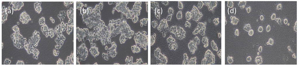 Bright field images of HT-29 cells with or without treatment of IBN-4-HRP and IAA: (a) HT-29 cells without treatment; (b) treatment with IAA (1.6 mM); (c) treatment with IBN-4-HRP alone; and (d) treatment with IBN-4-HRP and IAA (1.6 mM).