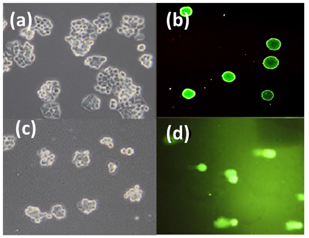 Microphotographs of bright field and fluorescent microscopic views of HT-29 cells: (a) Bright field view of untreated control cells (undamaged cells); (b) fluorescent microscopic view of untreated control cells (undamaged cells); (c) bright field view of cells treated with IAA (1 mM) and IBN-4-HRP (100 μg/mL) (shrunken morphologies); and (d) fluorescent microscopic view of cells IAA (1 mM) and IBN-4-HRP (100 μg/mL) (damaged cells with elongated tails).