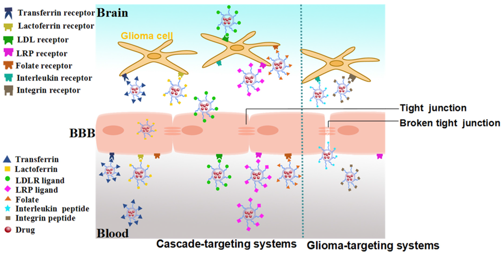 Usually, with the aggravation of glioma, the proliferation and invasion of cancer cells will cause a local disruption of the BBB and produce various mediators which can increase the permeability of the capillary endothelium [14,90]. On this occasion, BBB is no longer the main barrier for the drug delivery and some specific receptors on glioma and/or neovasculatures will play crucial roles.