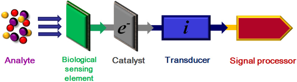 Specific molecular recognition of a target analyte is a fundamental prerequisite for the operation of a biosensor. Such recognition is based on the affinity between complementary structures; including enzymes and substrates, antibodies and antigens and hormones/signalling molecules and receptors, to generate concentration-proportional signals. A biosensor’s selectivity and specificity are thus highly dependent on the biological recognition systems that are interfaced, through an electrocatalyst, with a suitable transducer. The analysis of bio-analytes remains problematic, due to both the inherently labile nature of the species being detected, which are often present at low concentrations, and also due to the analytical matrix that will frequently contain unknown concentrations of potentially interfering species []. At the time of writing there is, with regard to the published literature, a shortage of data regarding issues such as long term material stability, sensor integrity and the reproducibility of results. Such issues, although possibly of less immediate interest to researchers, nevertheless have a significant longer-term impact on the ability of the technology to reach the market place.