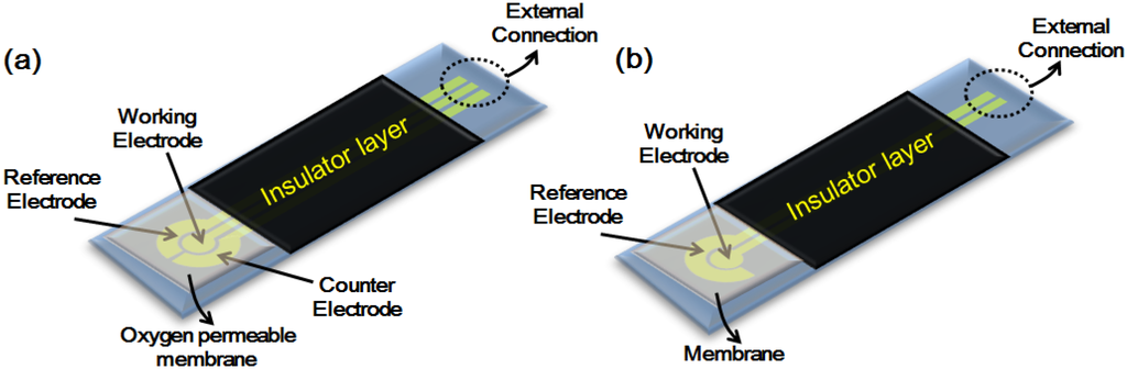 Showing (a) amperometric and (b) potentiometric electrode configurations.