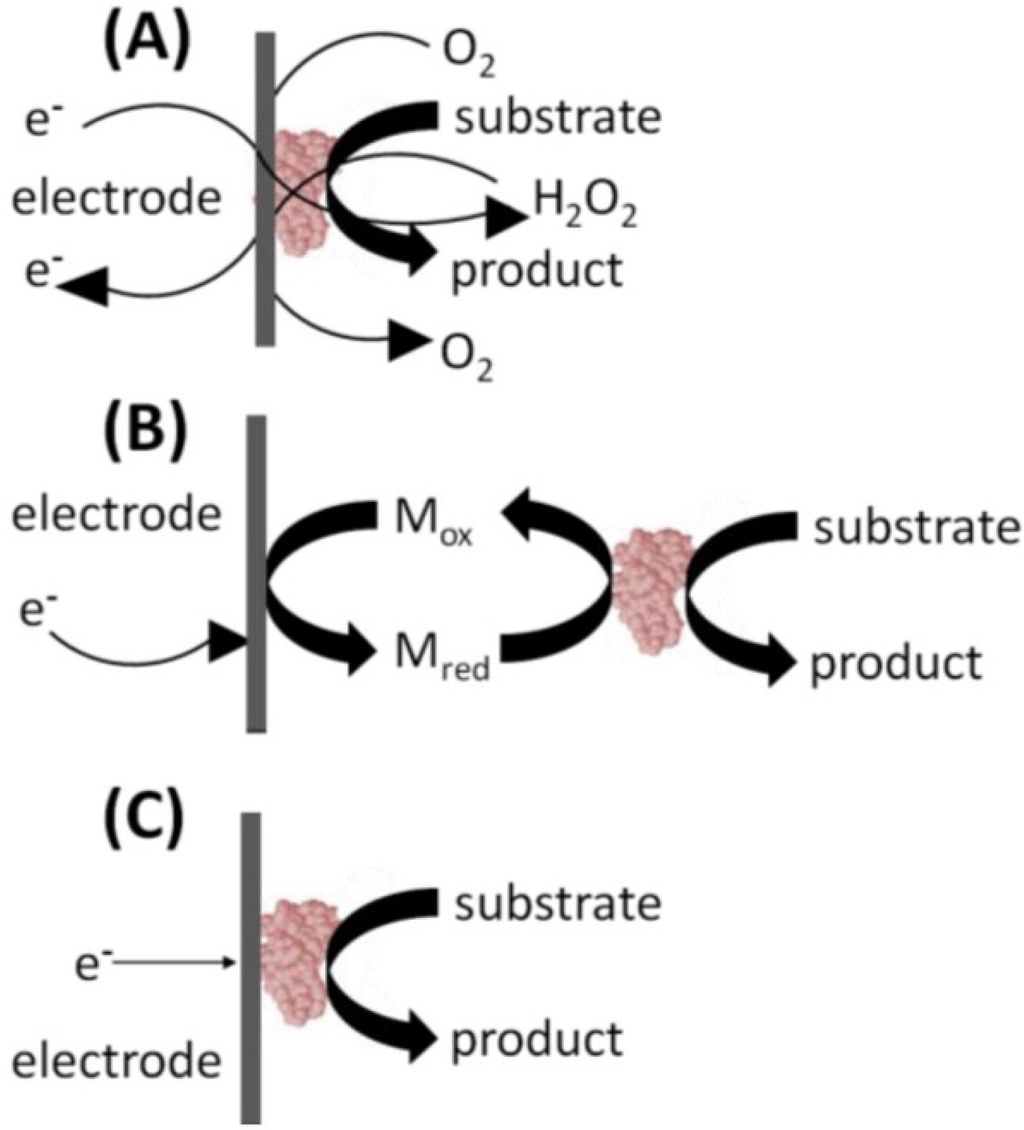Biosensor design progress is reflected in the so-called three “generations” of biosensors [], see Figure 3. The first generation of biosensors dates back to the first glucose biosensor developed by Clark and Lyons. First generation biosensors for glucose sensing used an oxidase enzyme, i.e., glucose oxidase (GOx) in conjunction with a dialysis membrane immobilized on the surface of a platinum electrode (Figure 3a). GOx is a selective catalyst whose action gives rise to the production of hydrogen peroxide (H2O2) that can be measured at a platinum electrode. Today most commercial bench-top amperometric biosensors rely on reactions catalyzed by oxidase enzymes, followed by the detection of H2O2 on Pt electrodes. The problem with this design is the loss in selectivity that occurs between the bio-recognition event and the amperometric H2O2 detection, while additionally the highly oxidizing potential (700 mV versus Ag/AgCl) necessary for H2O2 oxidation may result in unacceptable levels of interference from the oxidation of other electro-active species in complex analytical matrices.