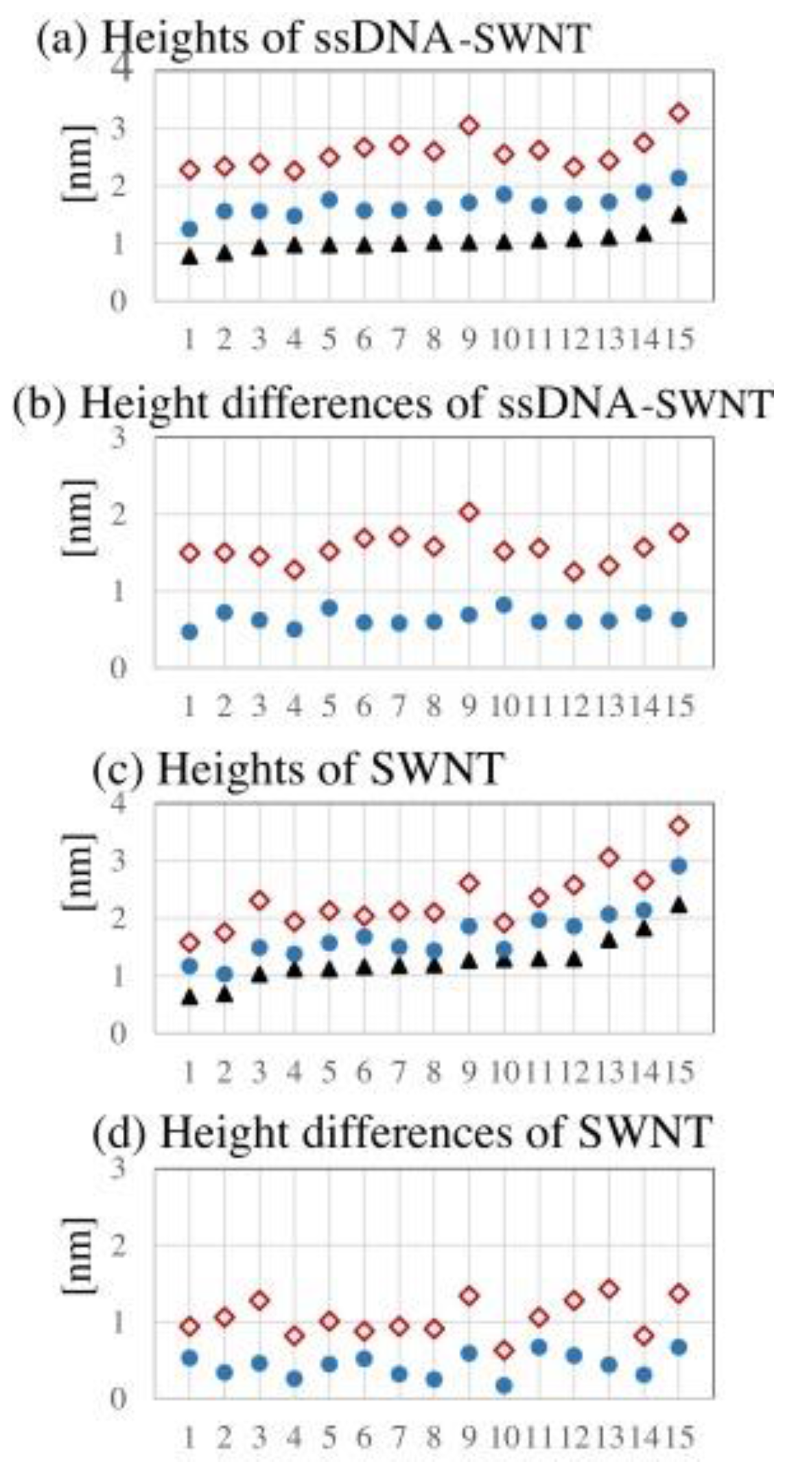 - Hayashida, T.; Umemura, K. Atomic Force Microscopy of DNA-wrapped Single-walled Carbon Nanotubes in Aqueous Solution. Colloids Surf. B 2016, 143, 526–531. [Google Scholar] [CrossRef] [PubMed]
