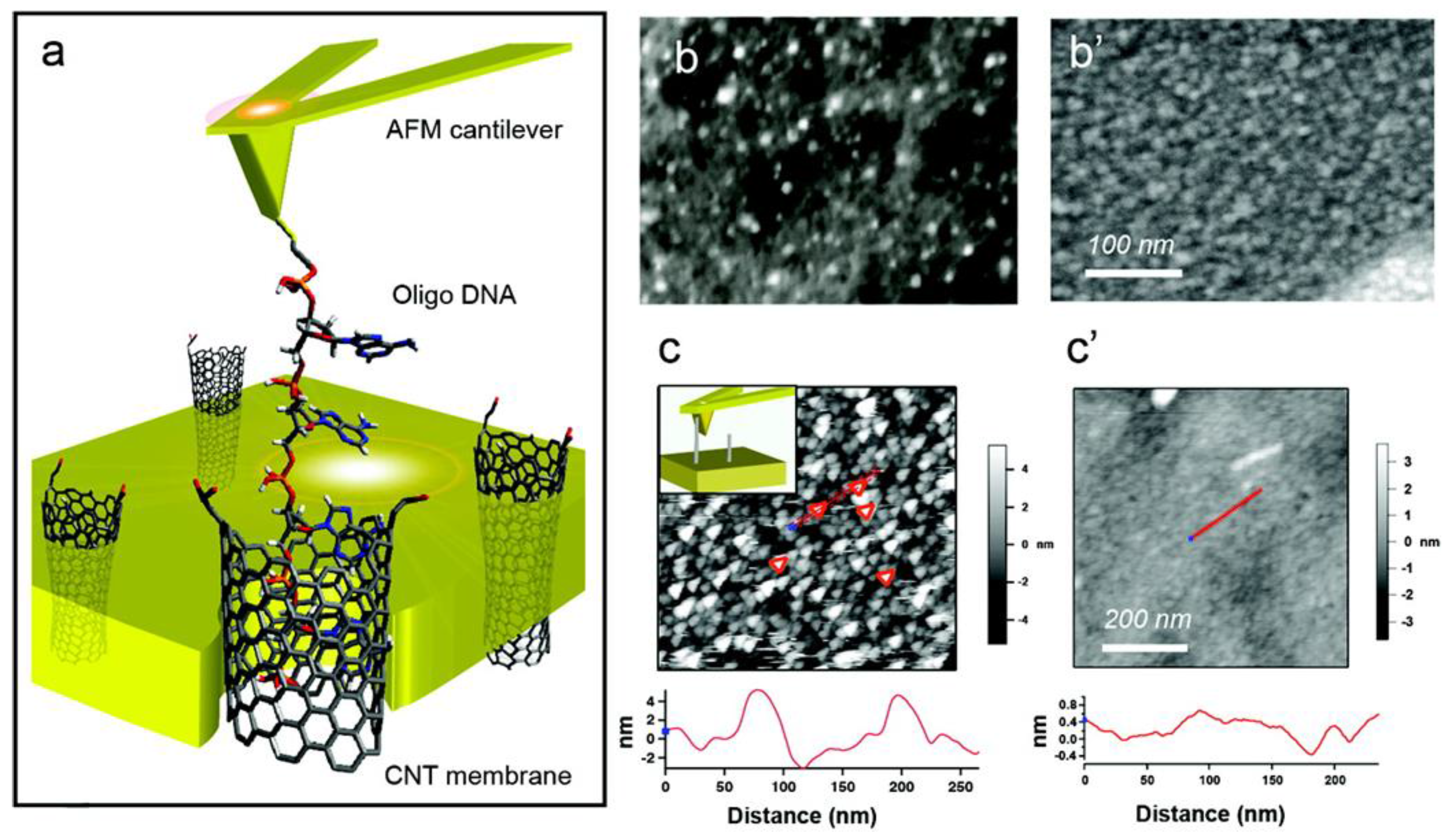 - Lulevich, V.; Kim, S.; Grigoropoulos, C.P.; Noy, A. Frictionless Sliding of Single-Stranded DNA in a Carbon Nanotube Pore Observed by Single Molecule Force Spectroscopy. Nano Lett. 2011, 11, 1171–1176. [Google Scholar] [CrossRef] [PubMed]