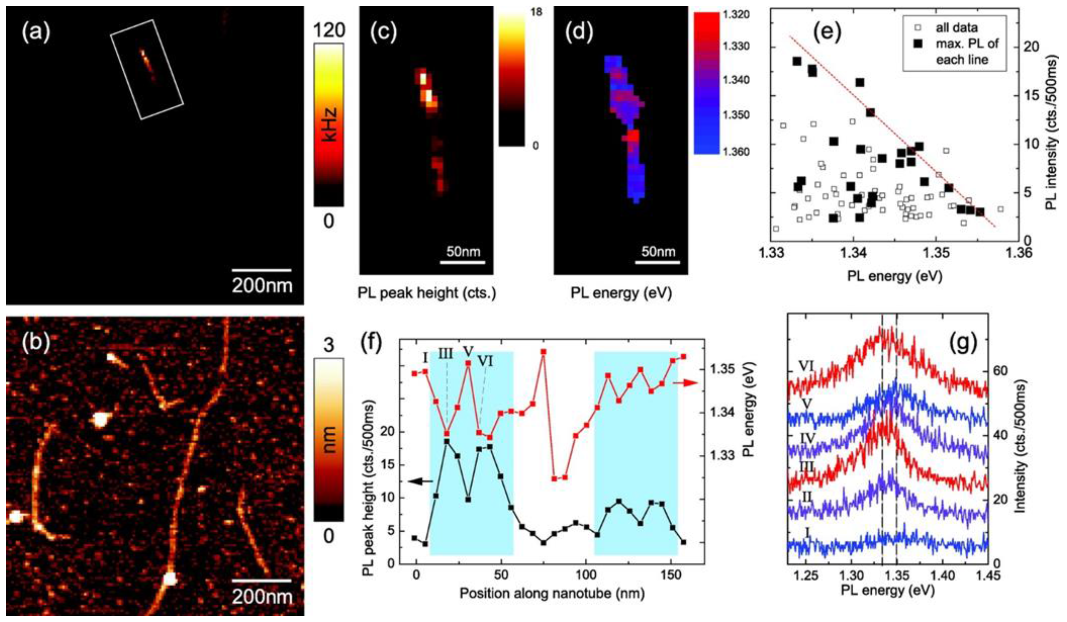 - Georgi, C.; Green, A.A.; Hersam, M.C.; Hartschuh, A. Probing Exciton Localization in Single-Walled Carbon Nanotubes Using High-Resolution Near-Field Microscopy. ACS Nano 2010, 4, 5914–5920. [Google Scholar] [CrossRef] [PubMed]