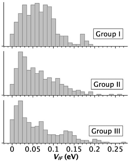 Distributions (normalized counts) of the computed transfer integral values for the three topology groups across the NMR structural models. The vertical axis reports the normalized counts. The group topologies are sketched in Figure 2 of Reference [].
