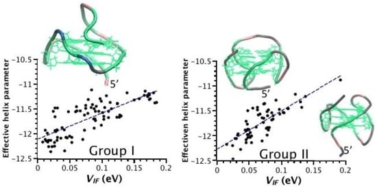 The scatter plots in Figure 3 have been obtained using a similar linear combination, but with the coefficients tuned to represent all the representative structures of groups I and II, with a reduced number of parameters (as discussed in Section 2.3). Such a global homogeneous structural quantity takes into account how the relevant part (inter-base parameters) of the entire helical shape correlates with the ability of the guanine stack to sustain charge transfer. It means that the global shape, rather a single parameter, is relevant for physicochemical function, at least for the specific function of charge transfer.