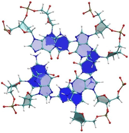 From each G-quadruplex we extracted one, two or three dimers of stacked G-tetrads, according to Table 2. A dimer is the fragment of the quadruplex constituted of two adjacent tetrads (Figure 4) and we label it (G4)2. These fragments, deprived of the backbone, were subjected to quantum mechanical (QM) calculations in the framework of density functional theory.