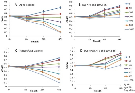 Fibroblast cell proliferation assay. Human fibroblasts were cultured with (B,D) or without (A,C) 10% fetal bovine serum (FBS) and various concentrations of silver nanoparticles (Ag NPs) alone or Ag NPs/chitin complex (Ag NPs/CNFS) for 2 days. Data represent the mean ± SD of 6 determinations.