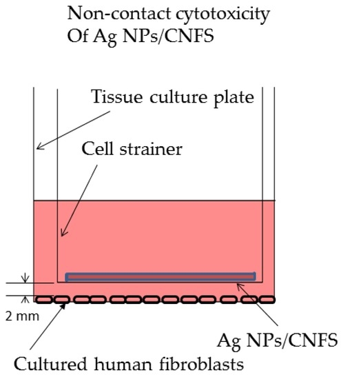 The fibroblasts were also seeded at a density of about 5 × 104 cells on a 6-well tissue culture plate (Sumitomo Bakelite Co., Ltd., Tokyo, Japan) and cultured in 3 mL of DMEM containing 10% FBS for 2 days. Ag NPs (6 μg)/CNFS (diameter: 20 mm, about 10 mg), or CNFS alone was placed on a round cell-strainer (40 μm Nylon, BD Falcon, San Jose, CA, USA). The distance between the cell layer and cell strainer was 2 mm (Figure 2). For the Ag NPs group, 2.3 μg of Ag NPs was added into the 2.5 mL of medium poured onto the cell strainer. These cell cultures were incubated in 2.5 mL DMEM with FBS and the antibiotics for 1 day.