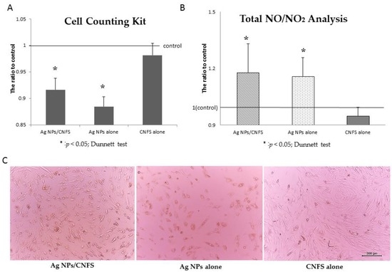 Oxidative stress has specific effects in cells, including oxidative damage to proteins, lipids, and DNA. To establish the role of oxidative stress as a decisive factor in Ag NPs/CNFS toxicity, cell growth assay and measurements of NO/NO2 levels were performed in this study. Ag NPs/CNFS as well as Ag NPs alone exhibited cytotoxicity in fibroblasts in this study by direct contact; the cytotoxicity could be partially ameliorated in the presence of 10% FBS (Figure 1). In addition, a significant increase of total NO/NO2 levels was also observed in both Ag NPs/CNFS- and Ag NPs-treated cell lysates in vitro. The identical increase of total NO/NO2 levels when treated with either Ag NPs/CNFS or Ag NPs might indicate enhanced inflammation [32]. In this study, there was no direct contact between the cells and Ag NPs/CNFS (Figure 3), and there was little detectable release of Ag NPs from Ag NPs/CNFS. However, since it has been reported that Ag+ may be rapidly released from Ag NPs in some conditions [33,34,35], the possibility that Ag release from Ag NPs/CNFS into medium was not ruled out. Although silver ions (Ag+) in the medium were measured using silver-ion detection kits, the sensitivity was low. Thus, the cellular uptake or direct interaction of Ag+ released from Ag NPs/CNFS cannot be ruled out as a major mechanism of the cytotoxicity of Ag NPs/CNFS since toxic concentration of Ag+ is very low. However, further investigation is required regarding the possible dissolution and cellular uptake of Ag+ or Ag NPs from Ag NPs/CNFS and the long-term safety effects in both humans and for the environment.