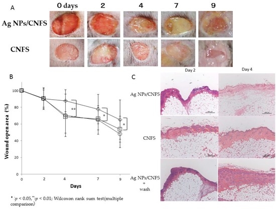 Effects of Ag NPs/CNFS removal and washing on wound epithelialization. Ag NPs/CNFS (◇) and CNFS (○) were removed, and Ag NPs/CNFS was removed and the wound was washed with saline (□) on the indicated day after wound creation, and digital photographs were taken to quantify the epithelialization rates (A and B). Each photograph was representative of six wounds (A). Data represent the mean ± SD of 6 determinations, Wilcoxon rank sum test (multiple comparison), * p < 0.05, ** p < 0.01 (B). Wound closure in the wash group was recovered by removal of Ag NPs/CNFS on day 4–9. Histological examination of reepithelialization and granulation of wounds treated with Ag NPs/CNFS on days 2 and 4, and each microphotograph was representative of six cultures (C).