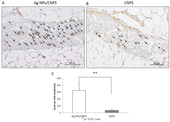Effect of Ag NPs/CNFS or CNFS treatment on oxidative stress in skin. Immunohistochemical (8-hydroxy-2′-deoxyguanosine, 8-OHdG) staining of skin sections was performed to measure the proportion of 8-OHdG-positive sites 1 day after treatment with either Ag NPs/CNFS (A) or CNFS (B). A significant increase in the number of 8-OHdG-positive sites was observed in the Ag NPs/CNFS group compared with the CNFS group. The arrows show the 8-OHdG-positive sites. Each microphotograph is representative of six samples (A,B). The number of 8-OHdG-positive sites in microphotograph of each sample (n = 6) were statistically analyzed (C). Data represent the mean ± SD of 6 determinations, ** Student’s t test, p < 0.01 (C).