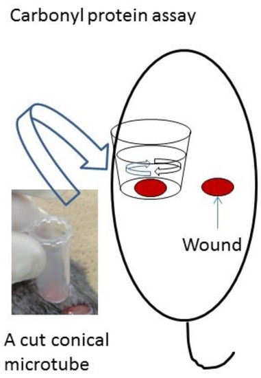 A cut conical microtube (1.5 mL) with 1 mL of PBS was placed on the wound, which was gently washed on days 2, 4, and 7 as illustrated in Figure 6. The collected washes were then centrifuged (3000 rpm) at 4 °C for 10 min, and the supernatants were subjected to measurement of protein contents using a protein assay kit (Coomassie Protein Assay Kit, Thermo Scientific, Waltham, MA, USA). The protein concentrations were adjusted to 10 μg/mL and carbonyl protein was determined using a protein carbonyl assay kit (OxiselectTM Protein Carbonyl ELISA Kit, Cell Biolabs, Inc., San Diego, CA, USA).