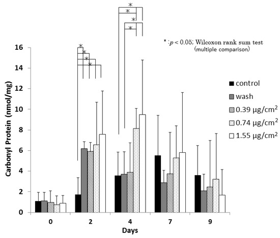 Protein oxidation, which produces carbonyl proteins, is defined as the covalent modification of proteins induced either directly by reactive oxygen species (ROS) or indirectly by reaction with secondary byproducts of oxidative stress [30,31]. Figure 6 shows a scheme of carbonyl protein assay. Carbonyl protein levels in the washes of 0.39 μg/cm2, 0.74 μg/cm2, and 1.55 μg/cm2 Ag NPs/CNFS-treated wounds were significantly higher on day 2 than those in the CNFS-treated group (Figure 7). In contrast, the wash group, which was treated with 1.55 μg/cm2 Ag NPs/CNFS for 2 days and then treated with 1.55 μg/cm2 Ag NPs/CNFS after washing the wound with saline on days 2 and 4 exhibited significantly lower values on day 4 than those of the continuously 0.74 μg/cm2 and 1.55 μg/cm2 Ag NPs/CNFS-treated groups. Thereafter, the amounts of carbonyl proteins in each group gradually decreased on day 7 and day 9, and there were no significant differences.