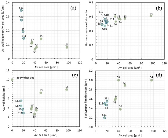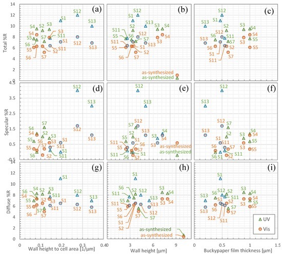 | Samples | % R (UV) | % R (Vis) | Cell Size (μm2) | Wall Height to Cell Size Ratio | Bottom Area to Cell Size Ratio | Wall Height (μm) | Buckypaper Film Thickness (μm) | ||