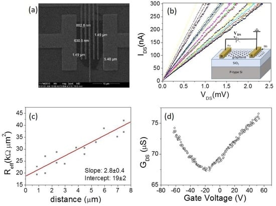 Graphene flakes were obtained from highly oriented pyrolytic graphite (from NGS Naturgraphit GmbH) by a scotch tape method and were placed on standard p-Si/SiO2 (300-nm-thick) substrates. After optical identification, the mono- or bi-layer nature of the flakes were confirmed by Raman spectroscopy. Metal contacts to selected graphene flakes were realized by means of electron beam lithography and magnetron sputtering techniques. Spin coating of approximately 400 nm PMMA-A7 (poly-methyl methacrylate) at 4000 rpm was performed on the sample, and it was successively exposed by an EBL system, Raith Elphy Plus (Dortmund, Germany). Methyl isobutyl ketone and then isopropanol was used as a developer. The metal electrodes were fabricated by a three cathode RF Sputtering Magnetron (by MRC Inc., Orangeburg, NY, USA) for in-situ multilayer deposition working at 10−7 mbar base pressure. The graphene flakes were contacted by a Nb/Au metallic bilayer (15 nm Nb/25 nm Au) with niobium contacting the graphene and gold working as a cap layer to prevent Nb oxidation and favor electrical connection with the probe tips. Metallic leads were sputtered at low power density (<0.7 W·cm−2) and small deposition rates (0.3 nm/s for Nb and 1.2 nm/s for Au) to prevent graphene damages.