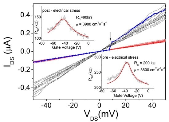 Output characteristics (IDS vs. VDS) and transfer characteristics (RDS vs. VGate in the insets) measured before and after the stabilization of the device due to electrical stress. Black arrow indicates the switch from higher to lower total resistance. Continuous (red) lines in the insets represent the numerical simulations obtained from the model of [32]. The contact resistance Rcontact is abbreviated as RC in the figures.
