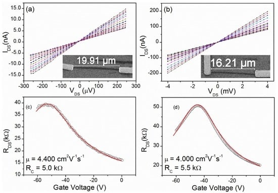 Electrical characterization under a high vacuum of two devices produced on the same substrate. (a,b) IDS vs. VDS curves for the devices shown in the insets with dimensions 19.9 µm × 0.7 µm and 16.2 µm × 0.3 µm, respectively. Curves are measured for different gate voltages in the range −60 V < VGate < 0 V with steps of 5 V. (c,d) RDS vs. VGate curves measured at VDS = 1 mV for the devices of Figure 3a,b, respectively. The solid (red) lines are the fitted model of [32] with the parameters listed in the plots.